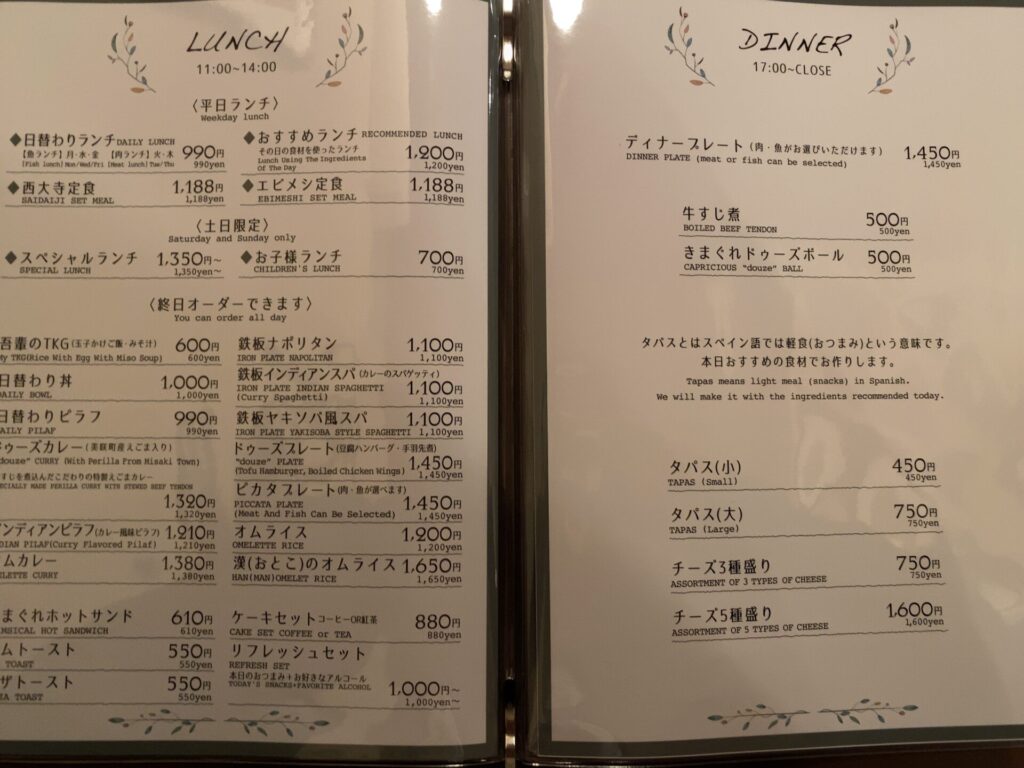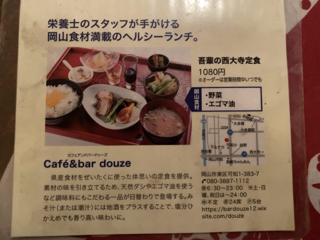 douzeのメニューはモーニングからランチ、そして夕食とアルコールも想像以上に充実!ヘルシーな西大寺定食が美味しそう