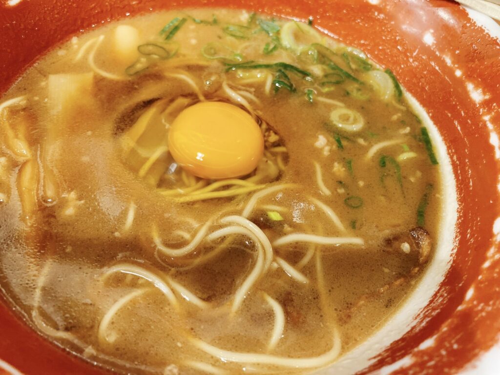 麺王のスープは熱々で、白身も所々で半熟になっています。