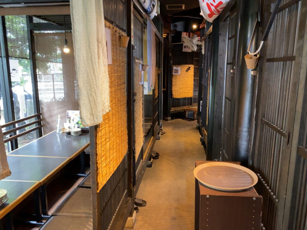 通路の両側が座敷で、お客さん同士の距離はとても離れているので安心です。