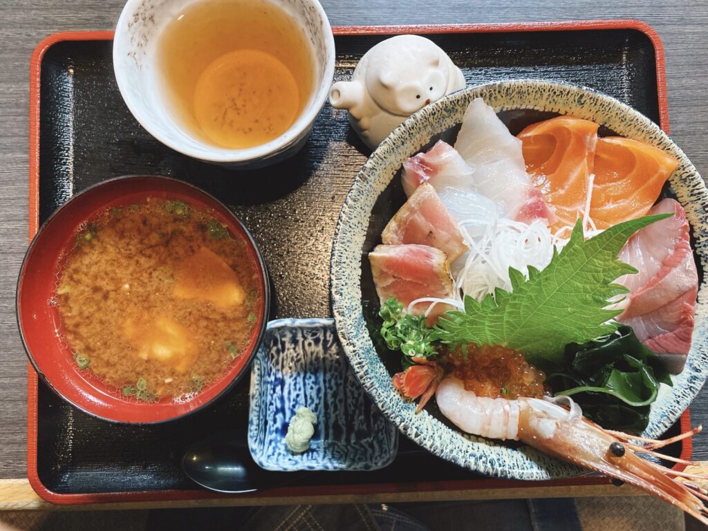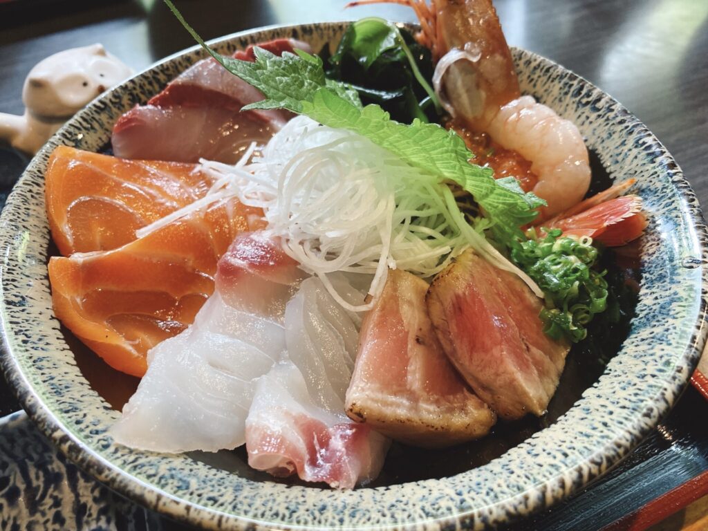 日替わり海鮮丼の炙り中トロが激ウマ!鯛やハマチのネタも新鮮で、今日のランチはトクした気分!!