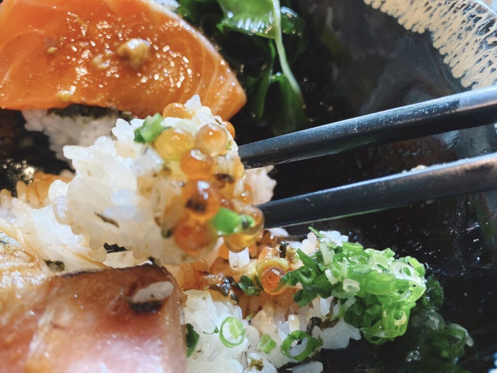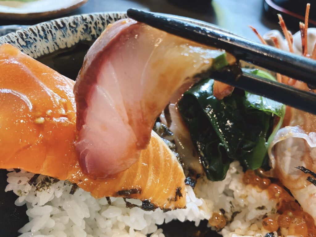 私は海鮮丼は、上から醤油をかけない派ですが、今回は炙り中トロをひと口食べたことで勢いが付いてしまい、醤油をかけてガツガツいっちゃいました。