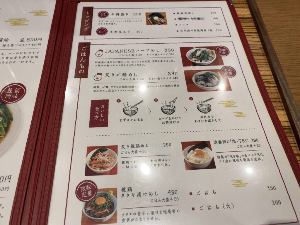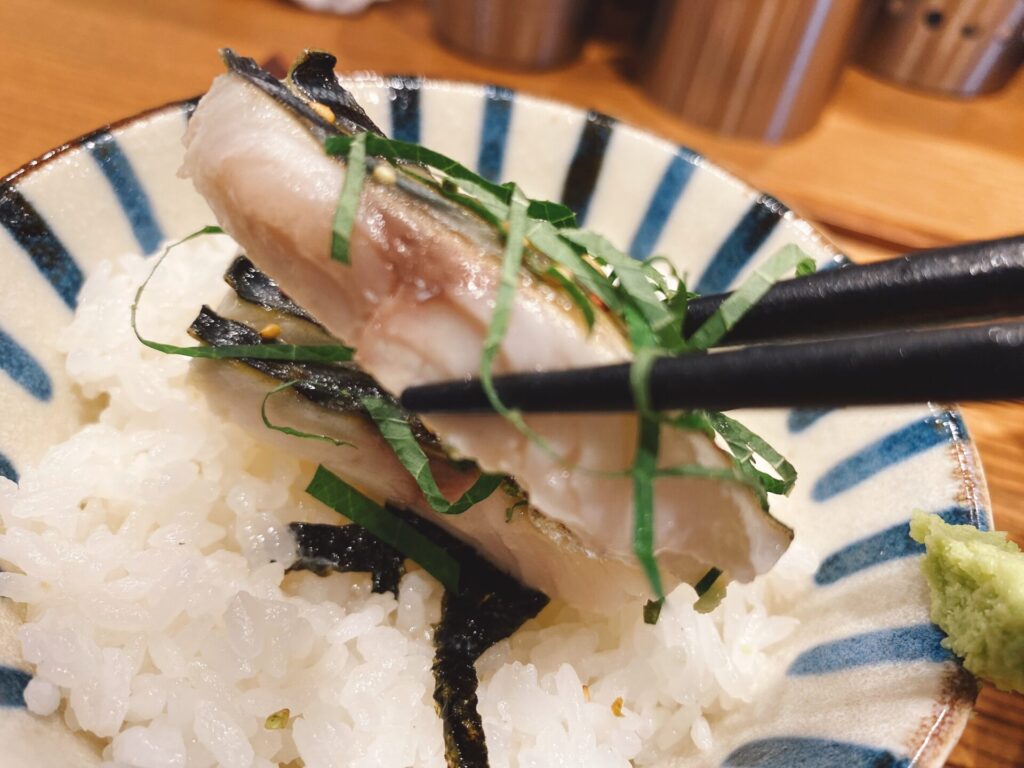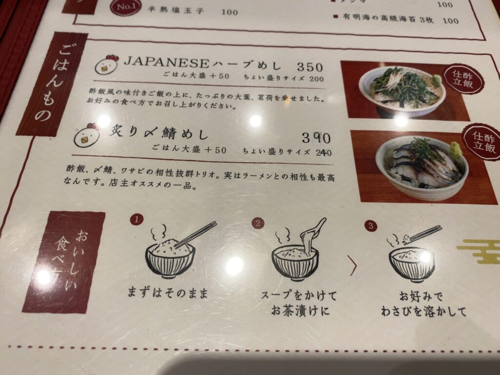 炙り〆鯖めしと、炙り親鶏めし、そして数量限定の種鶏タタキ漬けめしとで、ラーメン同様コチラでも迷いましたが、今回は炙り〆鯖めしをお願いしました。