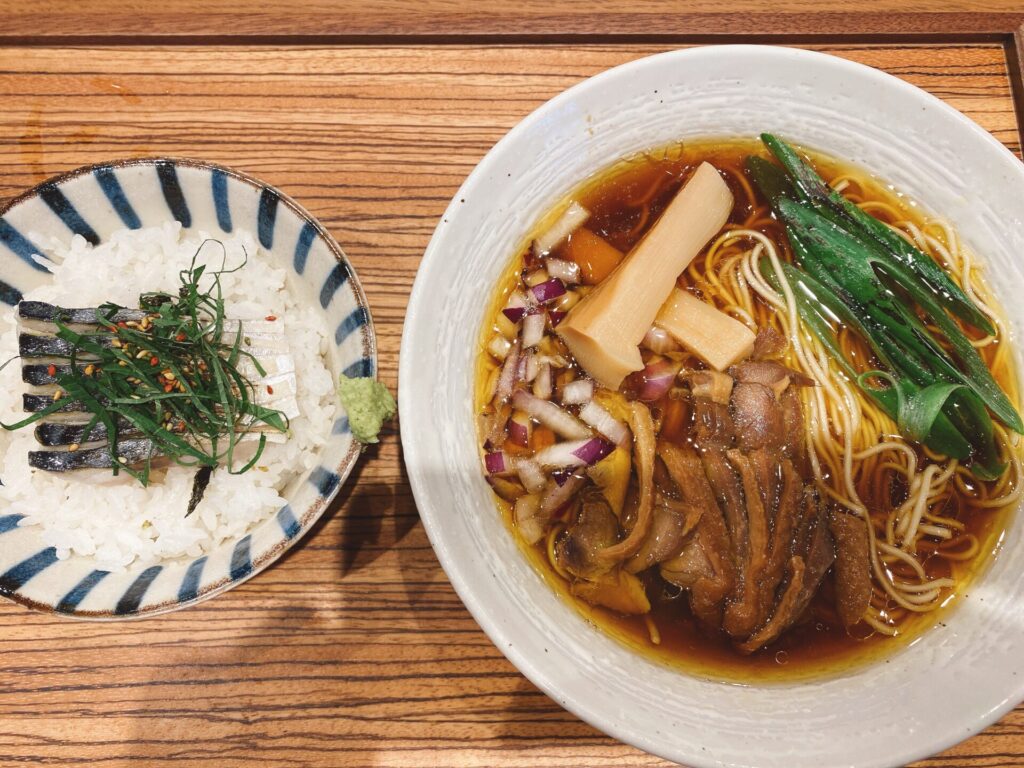全席満席となる状態だったので、10分ほどかかりましたが先に炙り〆鯖めしがきて、すぐに笠岡style生醤油ラーメンが着丼。