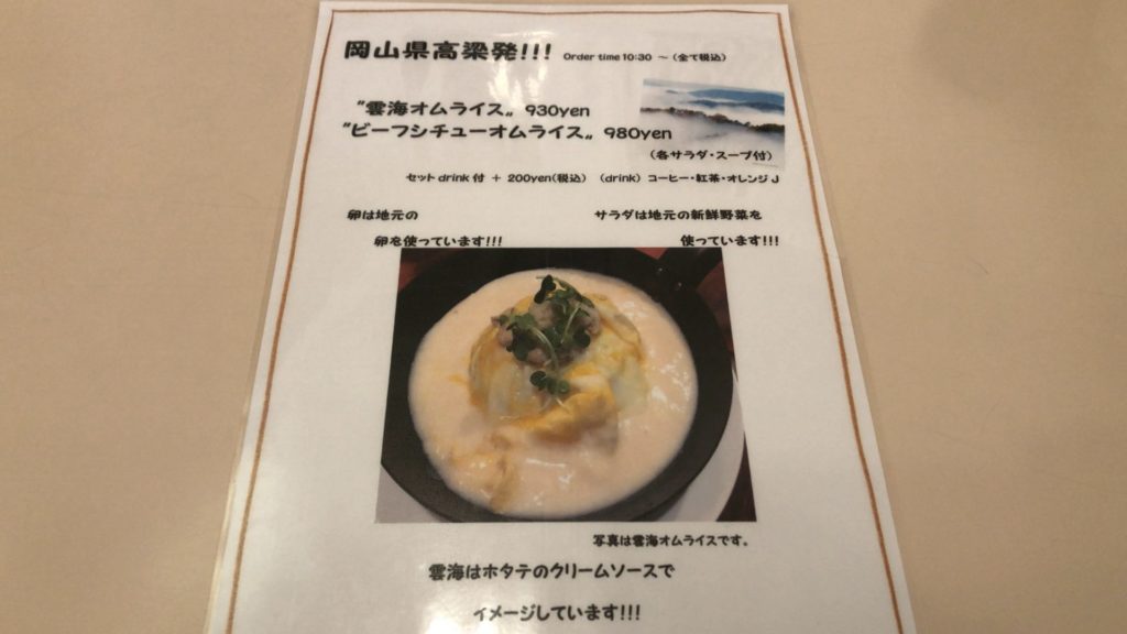 ランチメニューに迷いながらも、備中松山城を思い浮かべて「岡山県高梁発!」の雲海オムライスを、今日のランチに決定!