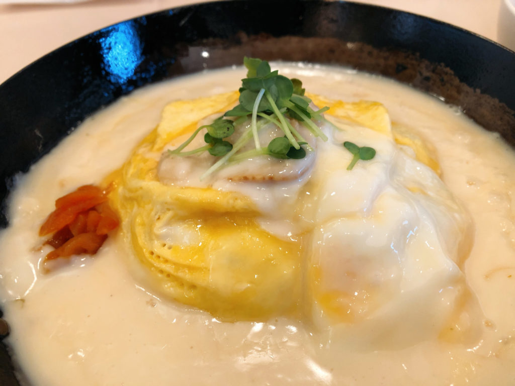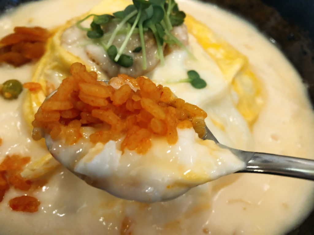 卵のフワフワ感とトロトロ感、そしてホタテのクリームソース、チキンライスがマッチしています。