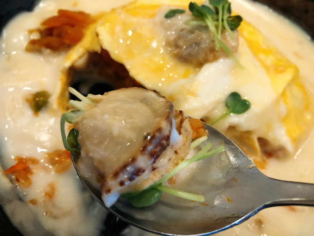 おーー、ホタテの出汁がとても効いた、濃厚なクリームソースがチキンライスを包んで口の中に広がります。