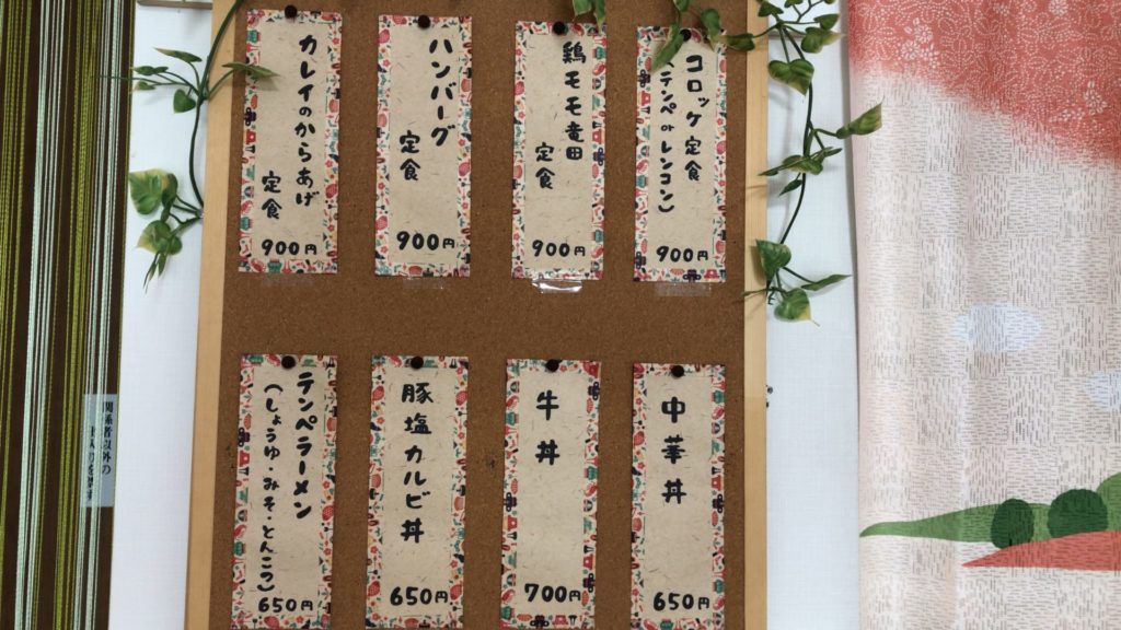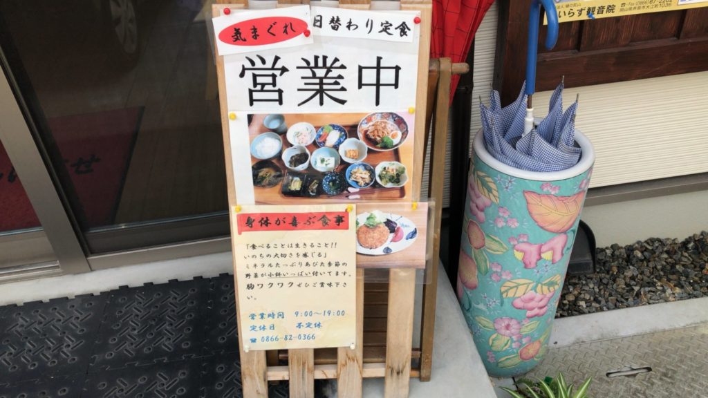入り口のところに立てかけられた営業中の看板には、品数の多い日替わり定食の写真が目を引きますね。