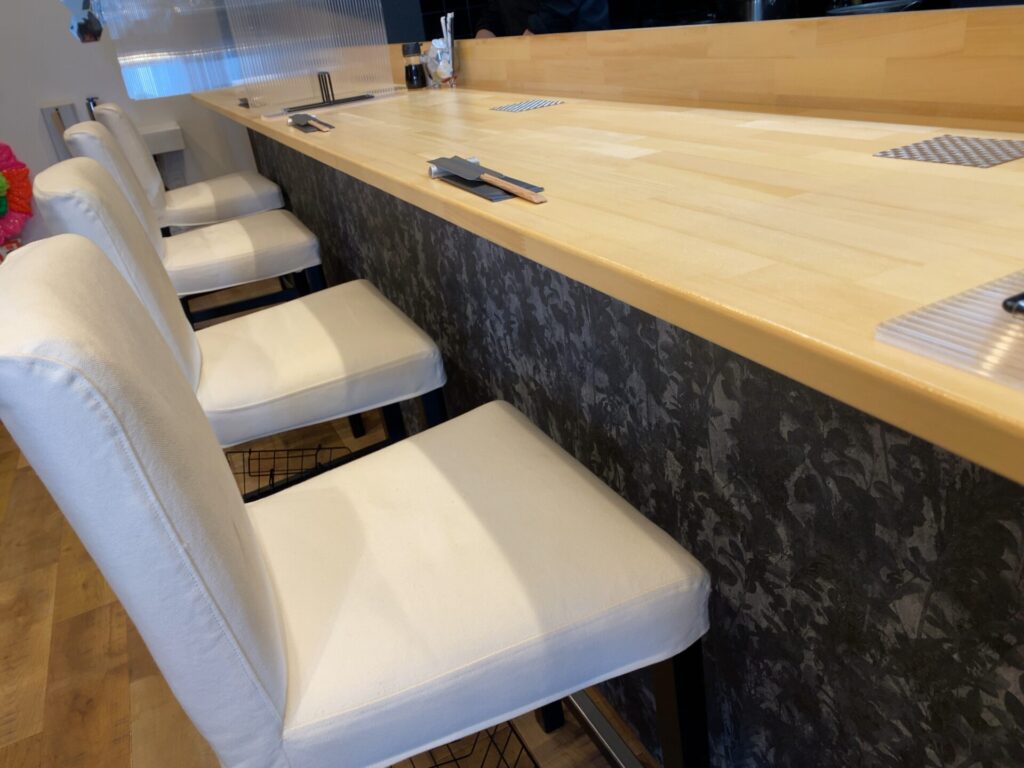 扉を開けると白の椅子と、キレイなカウンターが目に飛び込んできます。