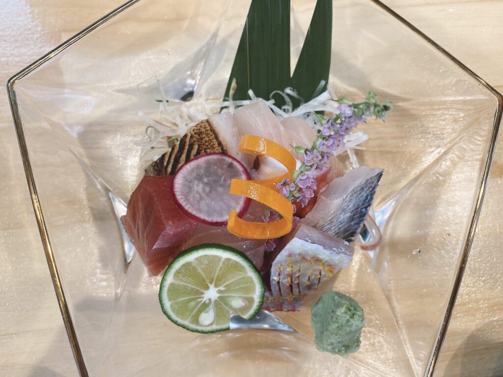 トンカツと海老しんじょを小鉢にシェアしているところに、別で注文した刺身の登場!