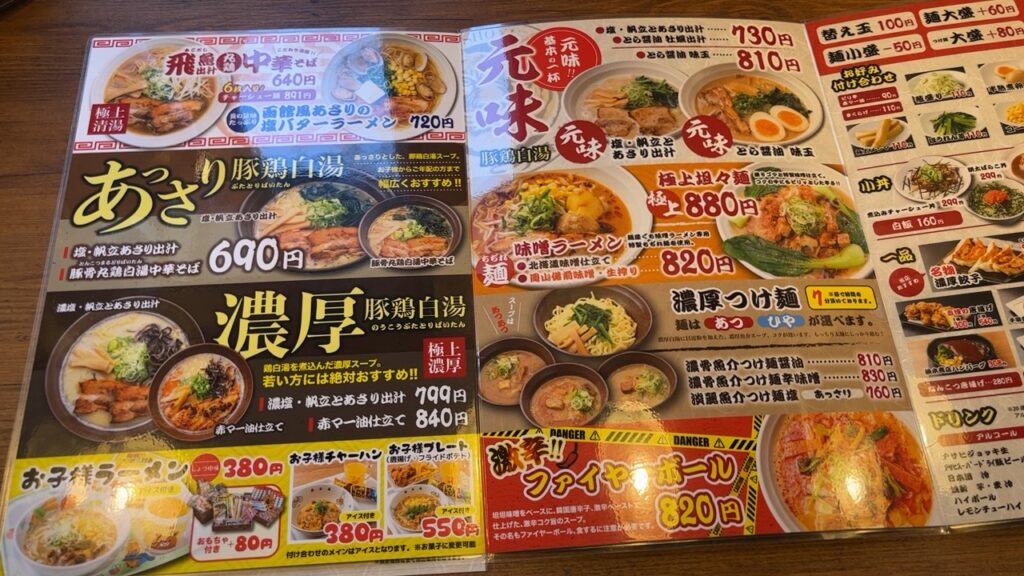 基本の1杯と書かれた元味に、味噌ラーメン、濃厚つけ麺、そして激辛ファイヤーボール!!