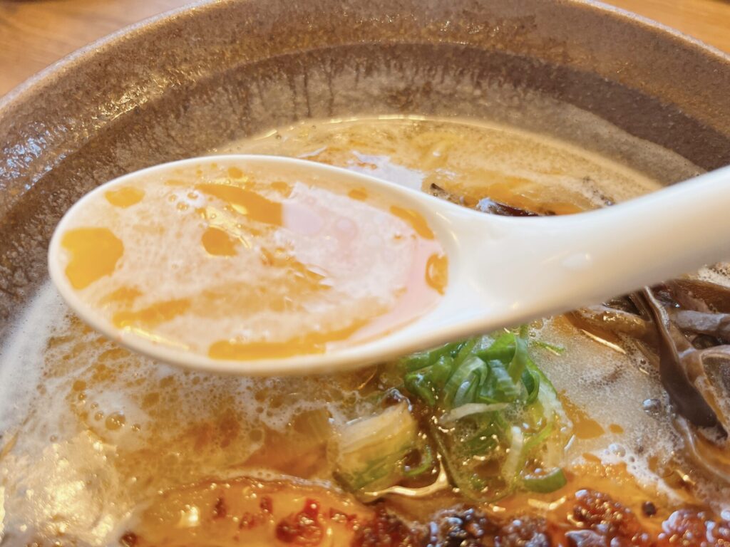 と、ひと口食べようとしたところに、濃厚豚鶏白湯赤マー油仕立てのラーメンが着丼です。