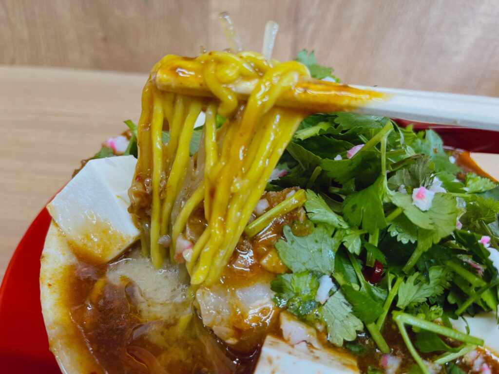 自家製麺の中太縮れ麺が、とろみの付いた熱々のスープをしっかりと持ち上げてくれます。