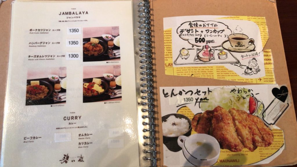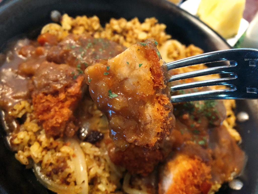 肉厚のカレーソースのポークカツ、スパイスがムラなく染み込んだ米粒、碧い森のジャンバラヤは噛むほどに味が出る!