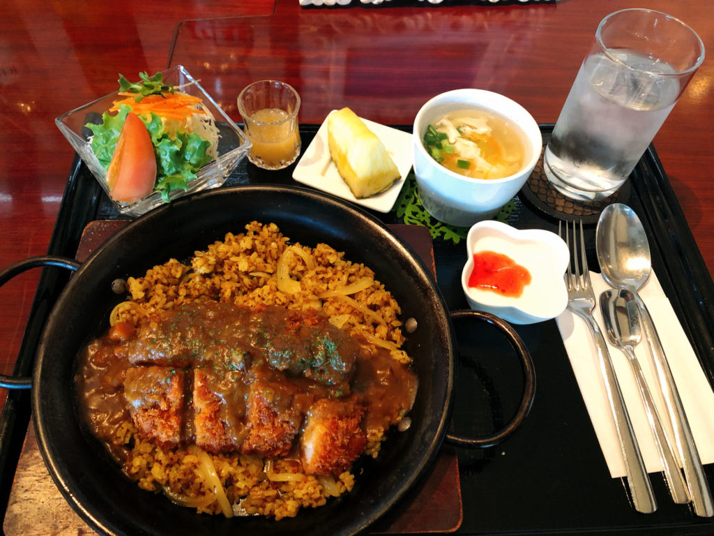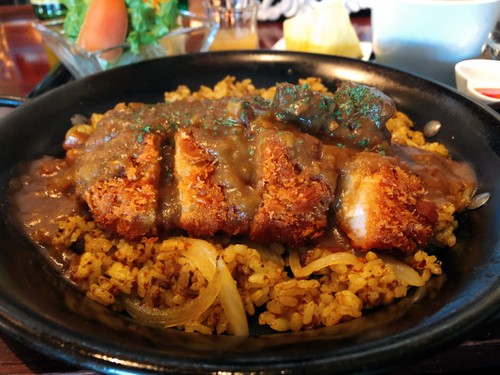 西大寺駅から車で5分 カフェ碧い森でのランチは、熱々の鉄皿で食べるジャンバラヤのポークカツジャンを選択!