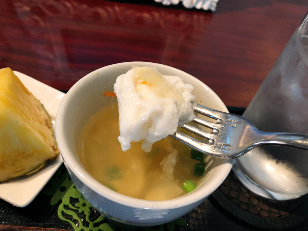 合間に食べるシャキシャキの新鮮なサラダや、フワトロ卵の入ったスープが、また食欲を復活させてくれます。