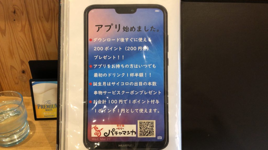 そしてメニューの最後のページに、アプリをダウンロードすると200円分のポイントがもらえると!!