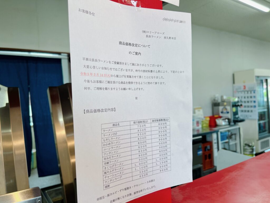 ※メニューの金額は、ラーメンを中心に先日(令和5年3月14日)から値上げされたようですが、光熱費や材料費が上がっているので仕方ありませんよね。