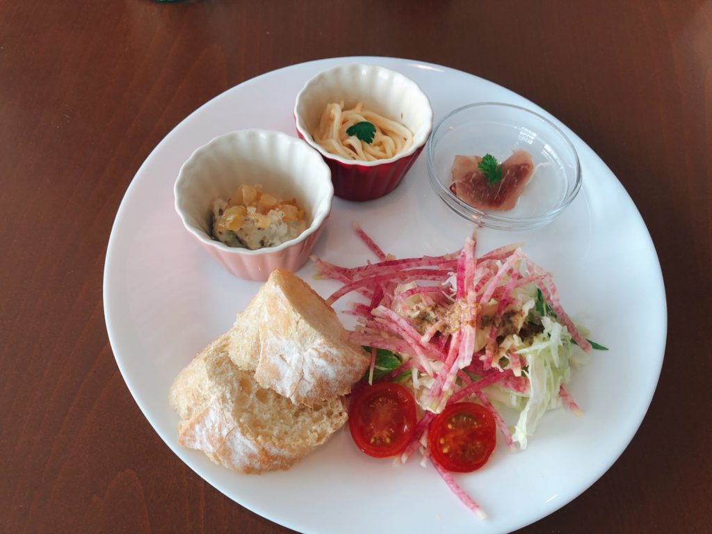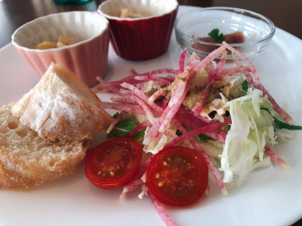 お皿に小鉢を一つずつと、サラダを盛り、パンも切って乗せました。