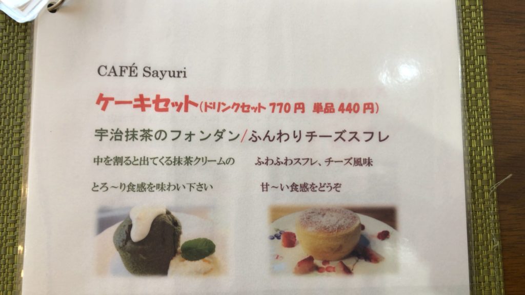 ケーキセットの、宇治抹茶のフォンダン、ふんわりチーズスフレは、スイーツ系をあまり食べない私が見ても美味しそうです。