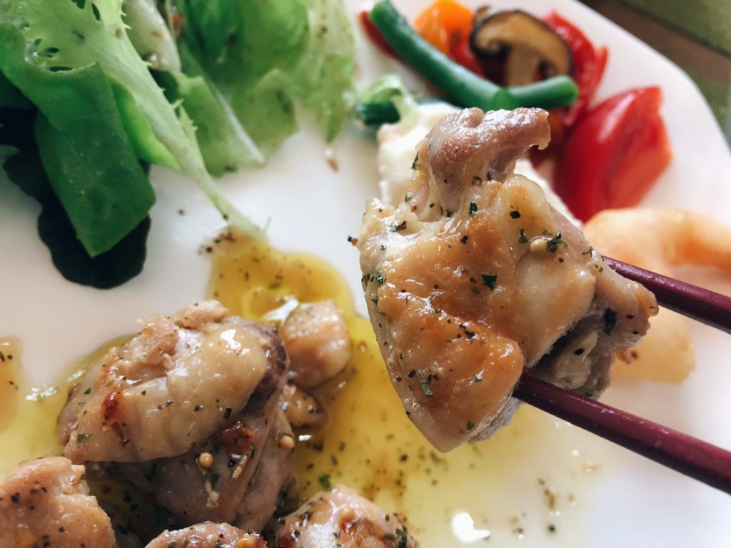 オリーブオイルとバジルの風味が鶏肉を包みます。