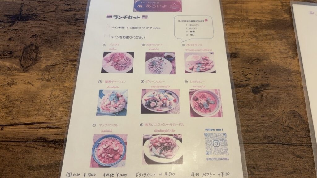 ガパオライスとあろいよスペシャルヌードルは辛さ調整できます。