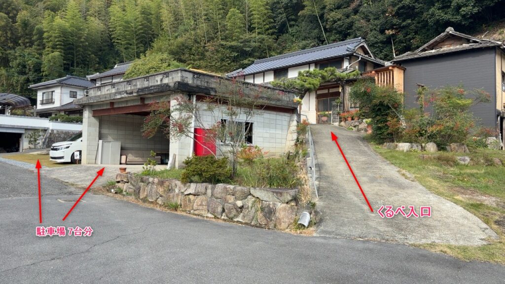 矢印の通り、屋根付きのところに2台、芝生のところに5台と計7台分のスペース。