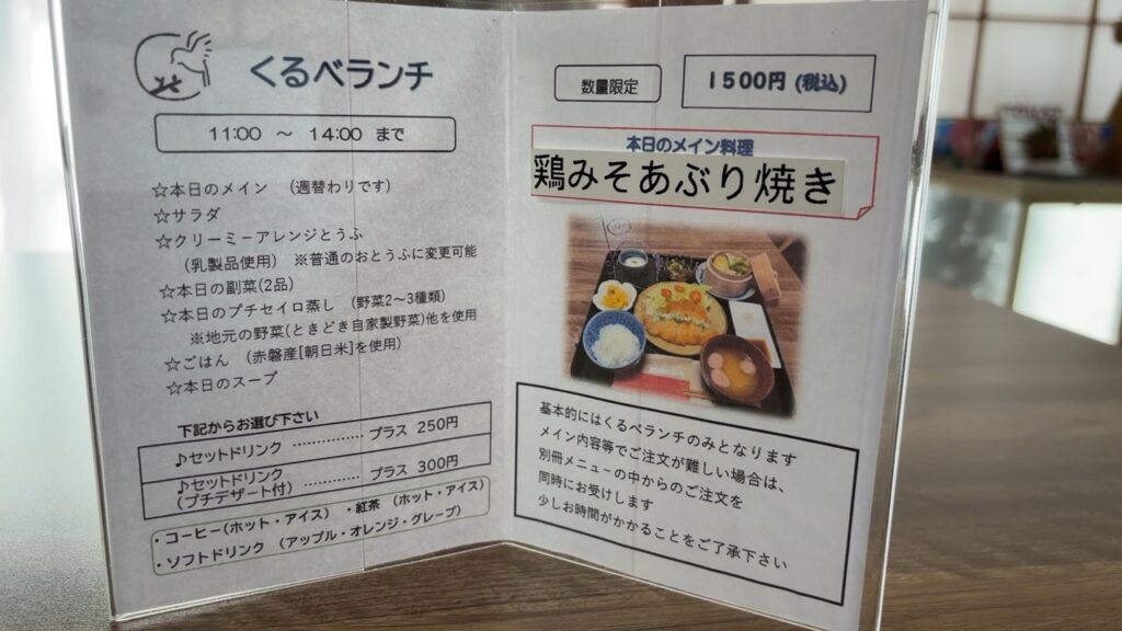 私たちはくるべランチを注文して、私はセットドリンク250円、相方はプチデザート付セットドリンク300円を追加オーダーしました。