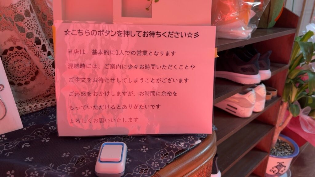 その前に、入口の扉を開けるとスグ左に、このような案内とボタンがありますので押して待って下さいね。