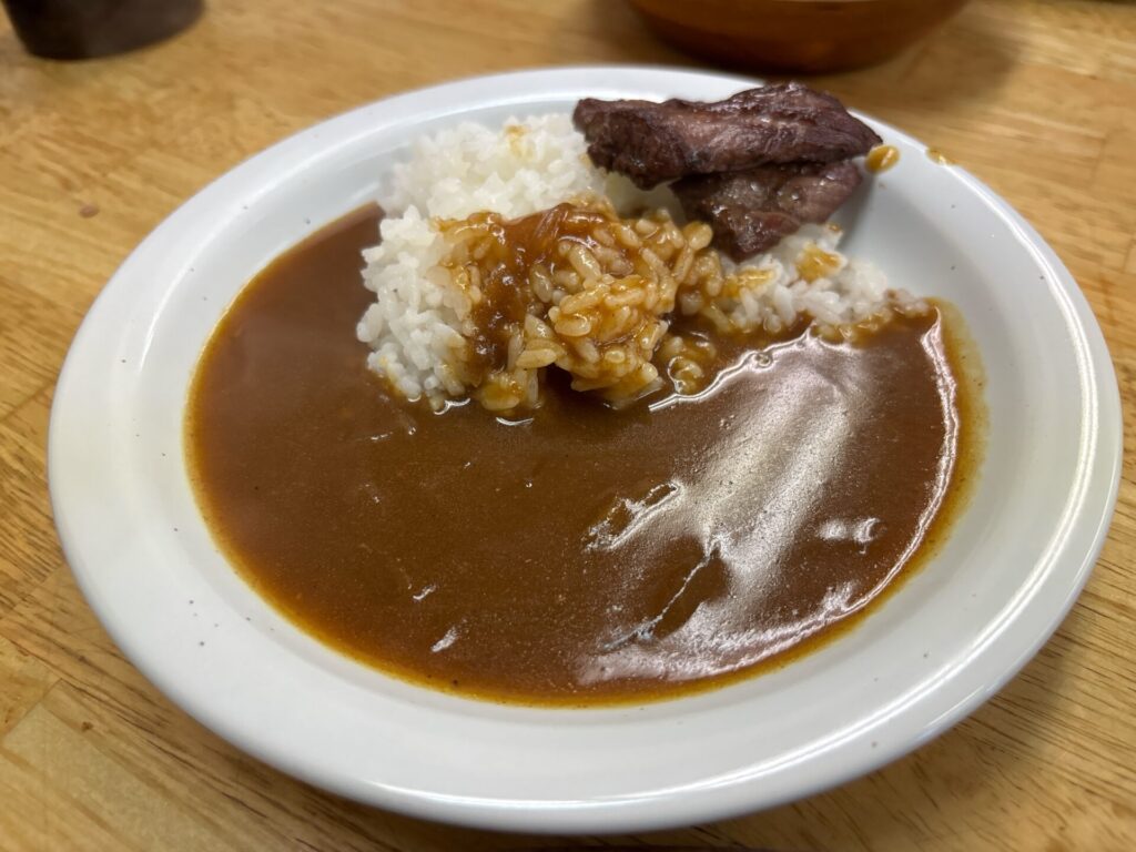 私も満腹ながらも、カレーにハラミの残りをトッピング。