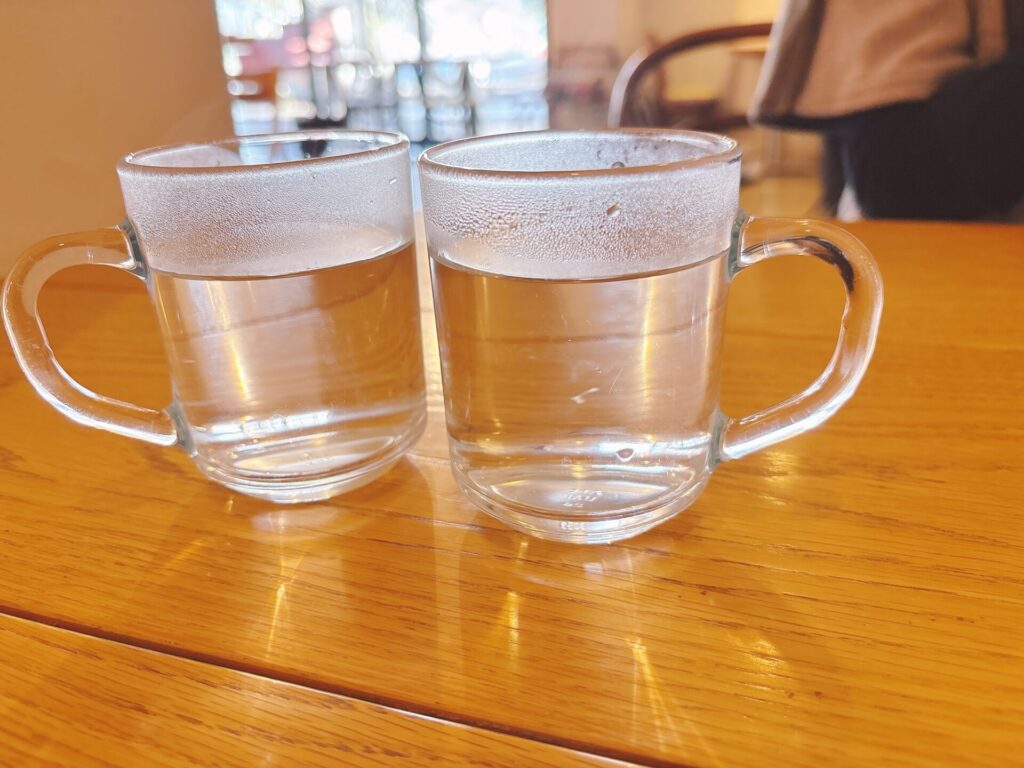水とか基本的にセルフになっていますが、今朝はとても寒かったこともあったのか、スタッフが白湯を準備しくれました。