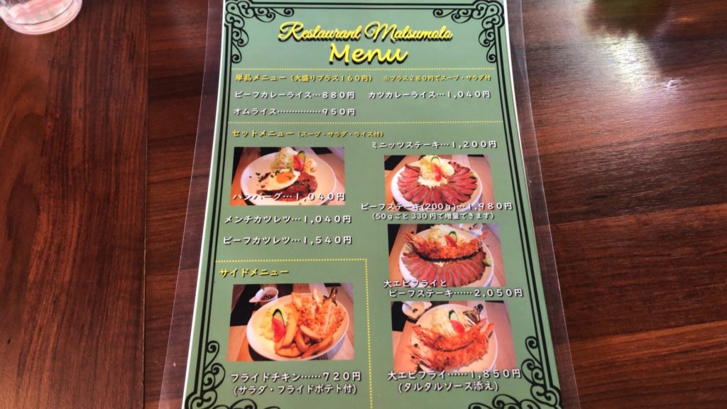 レストランまつもとの人気メニュー、牛サーロイン ミニッツステーキをオーダーするも、デミメンチカツとエビフライも美味しそう!