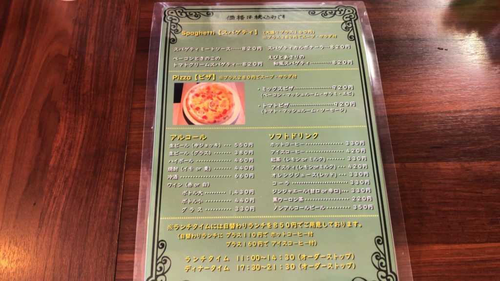 裏はスパゲティとピザ、そしてドリンクメニューですね。