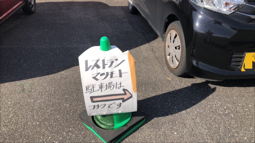 店の前と、突き当りの2ヶ所にこの案内がありますので、間違えないように停めてくださいね。