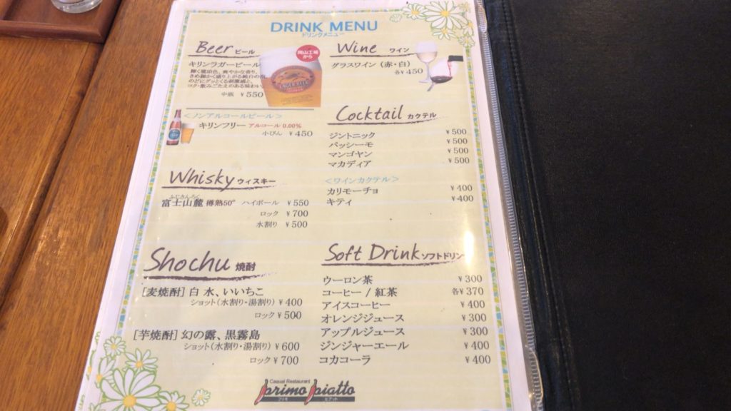 プリモビアットでは、ドリンクバーが別途200円、デザートが300円でお願いできます。