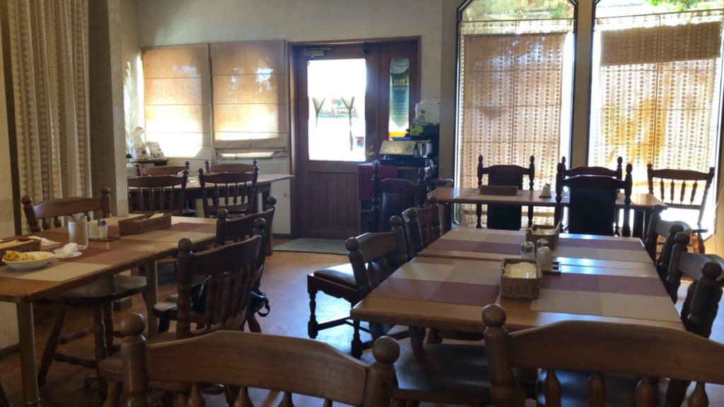 二軒目、開店の11時半まで駐車場で待ち、一番乗りで入店しようとするも、ドアに「土日のランチは無なり夜のみの営業になりました」の張り紙。