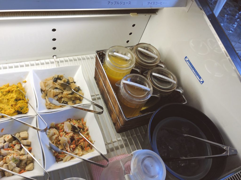 オレンジジュースとアップルジュース、アイスコーヒーにアイスティーがあり、この右側にホットコーヒーのポットも準備されていました。