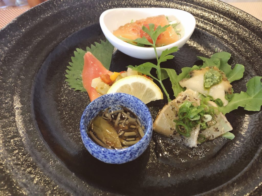 サラダもどれも外れなく美味しい、と話しているところに嫁の注文したプリモランチの、「本日の前菜三種盛」がやってきました。