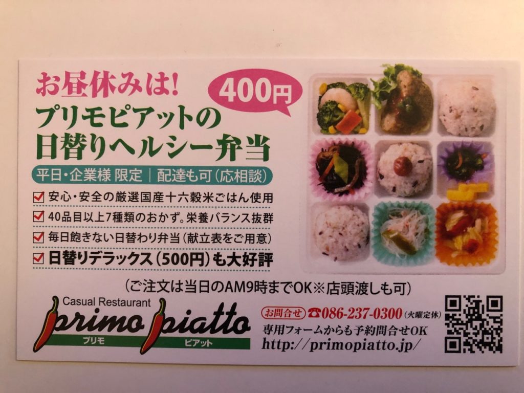 追記ですが、プリモピアットでは、平日の企業様限定ではあるものの、日替わりヘルシー弁当もっていうのもやっておられるようです。