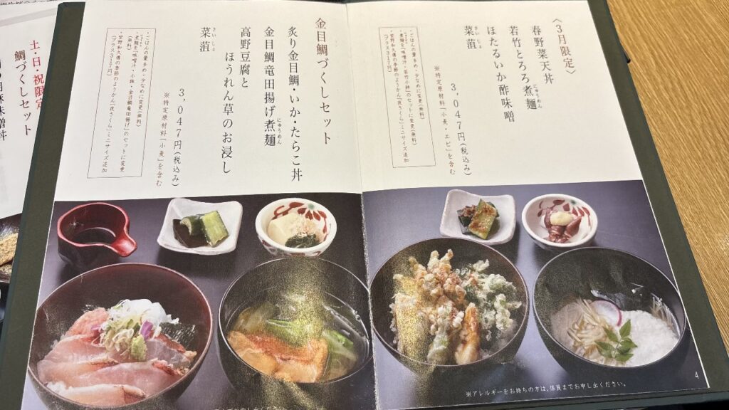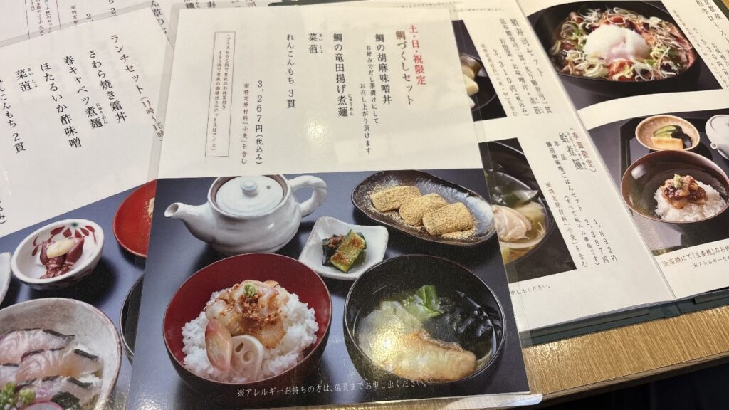 友人は、土日祝限定の鯛づくしセットにして、私は金目鯛づくしセットに決めてオーダー完了!