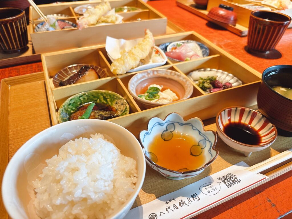 銀シャリ御膳から選んだランチメニューは、一番人気の満開御膳!ご飯のお供の厳選玉子「豊後の息吹」も外せない!!