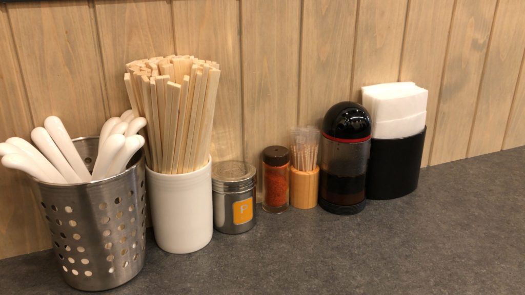 テーブルに置かれた調味料は、胡椒と一味と醤油かな?