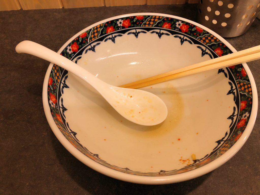 麺と具をさらえて、残ったスープを丼から直接口に流し込み、完食です。