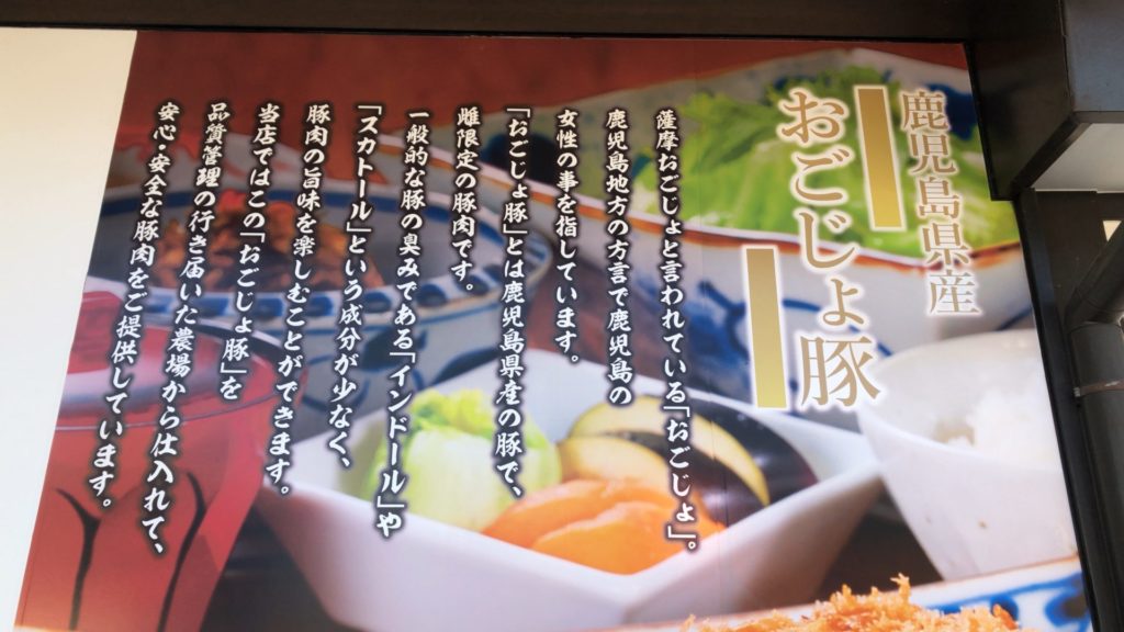 入り口横の壁に掲げられた看板に、ふく徳で使われている鹿児島県産の「おごじょ豚」の云われや、特徴が書かれています。