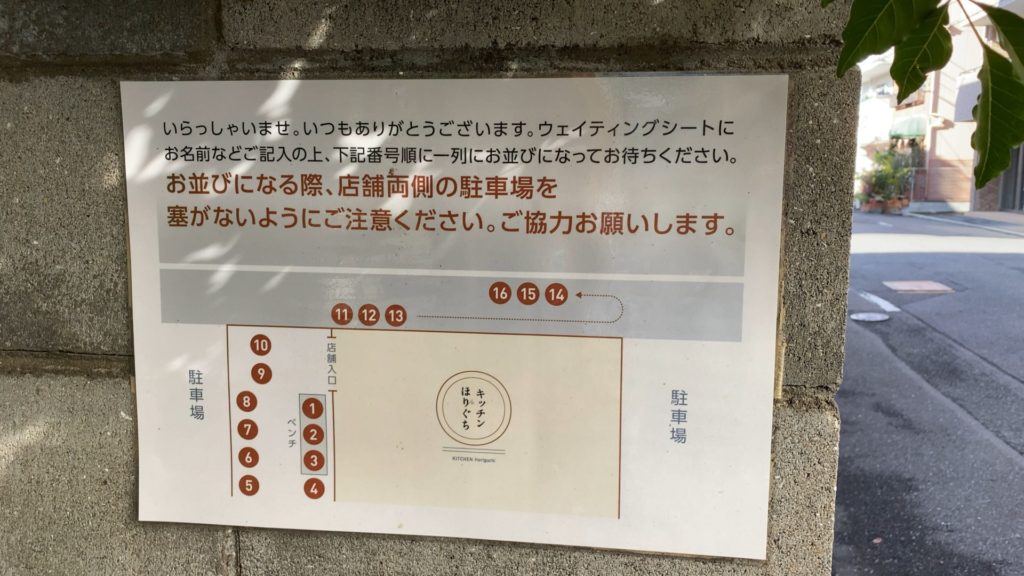 ここで、入り口前に名前を書くところがありますので、先に来られたらまず名前を書いておきましょう!