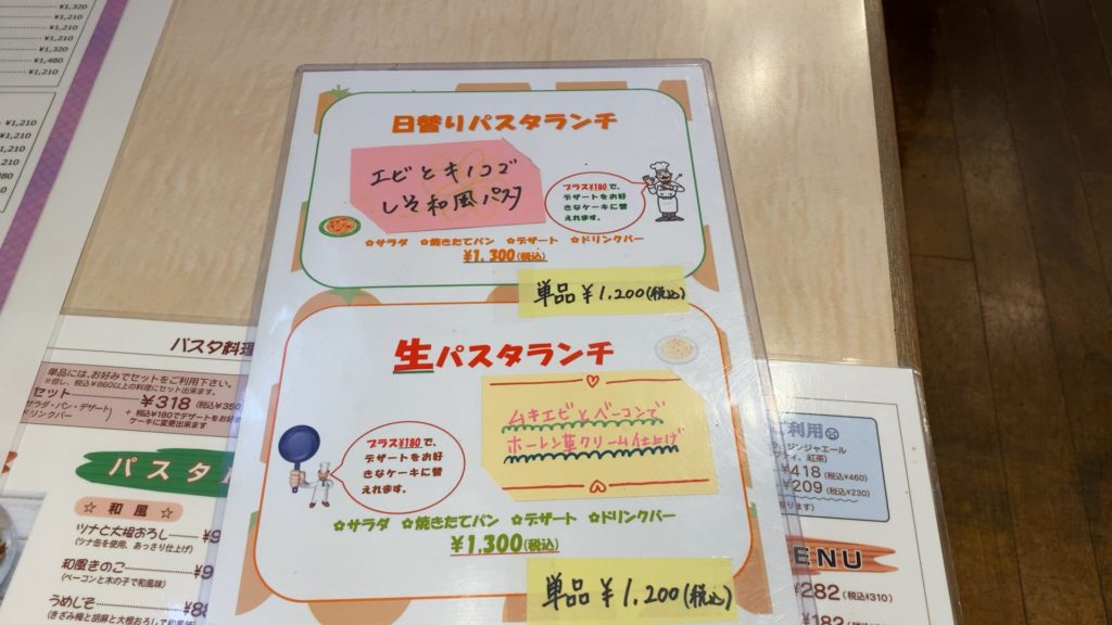 注文するこ頃には、家族連れやカップル等が何組か来店されていましたが、玄関入り口にあった「パスタランチ」と「ごはんランチ」が人気があったようです。