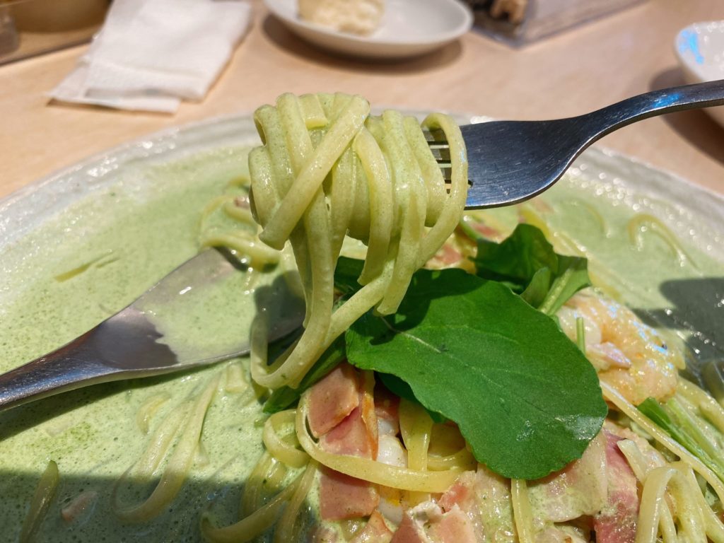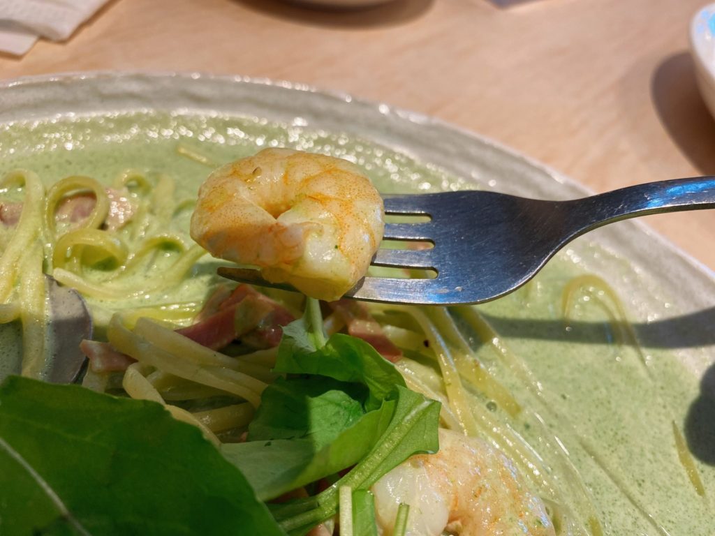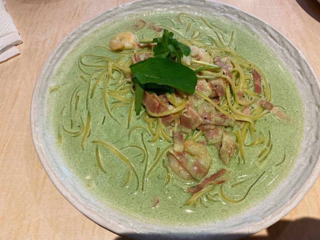 ビジュアル的に初めて見る、ホーレン草クリームに浮かぶ生パスタをエビと一緒に、たっぷりソースで頂く!