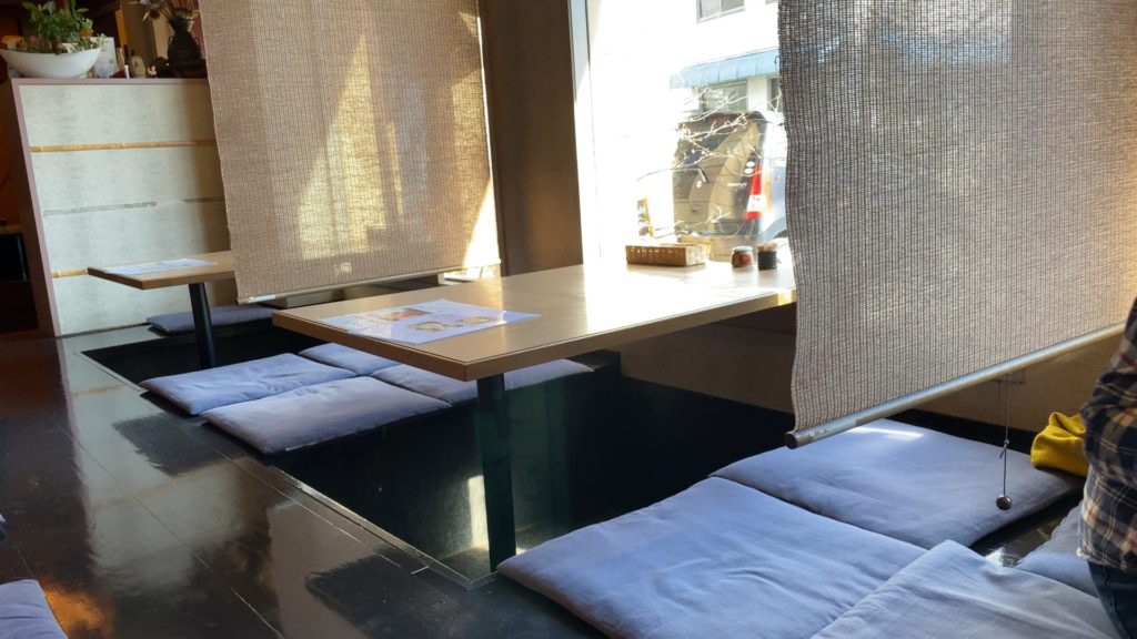 カウンターの後ろに、こちらも掘りごたつ式の4人用の座卓が3つあり、こちらはガラス窓で解放感がある感じ。