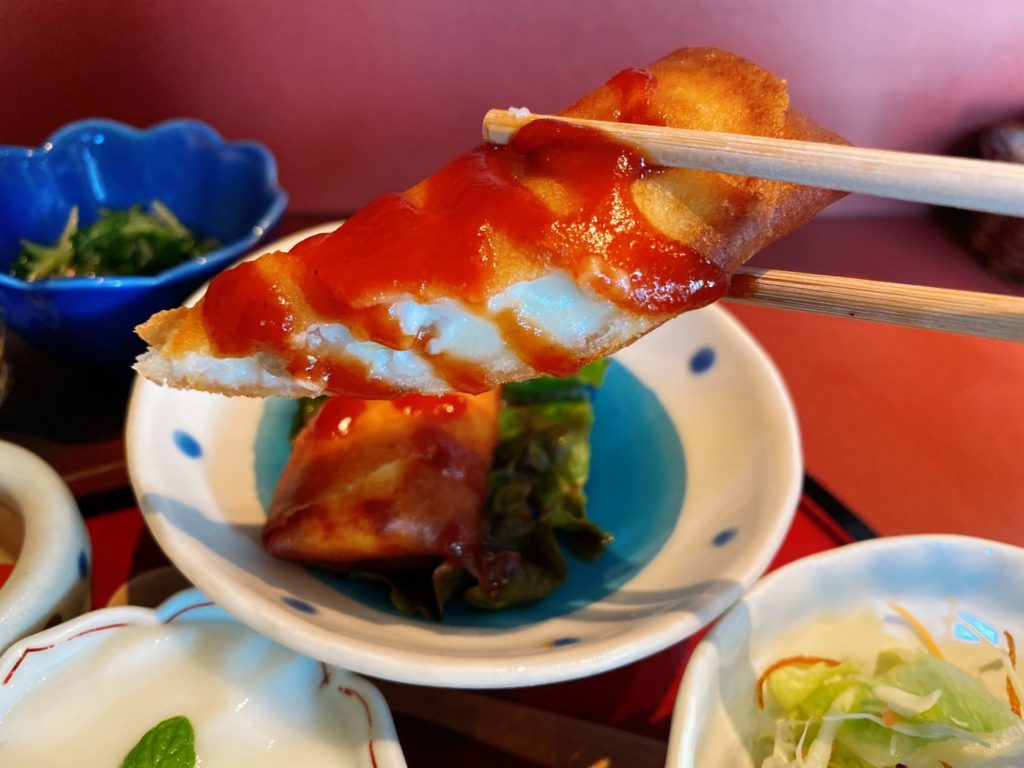 揚げたてで、サクサクの春巻きの皮の中のグラタンのソースが、トロっと口の中で広がります。