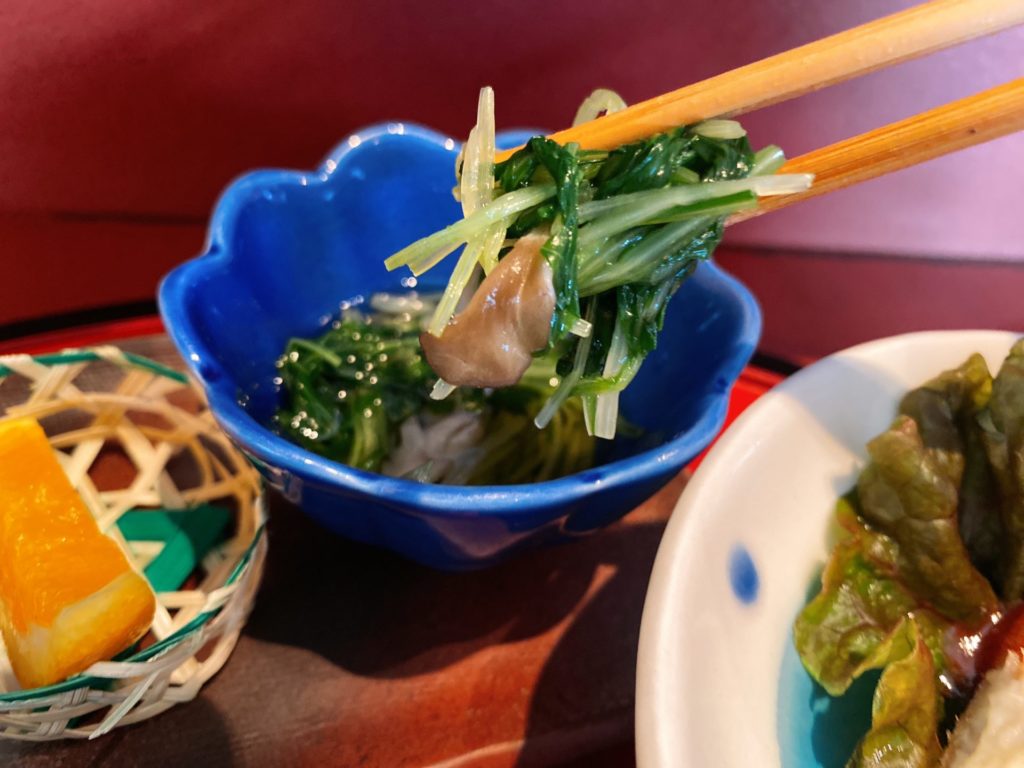 胡麻豆腐、マカロニの入った野菜サラダも美味しかったですが、こちらの水菜と舞茸のお浸しも気に入りました。