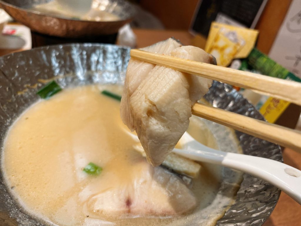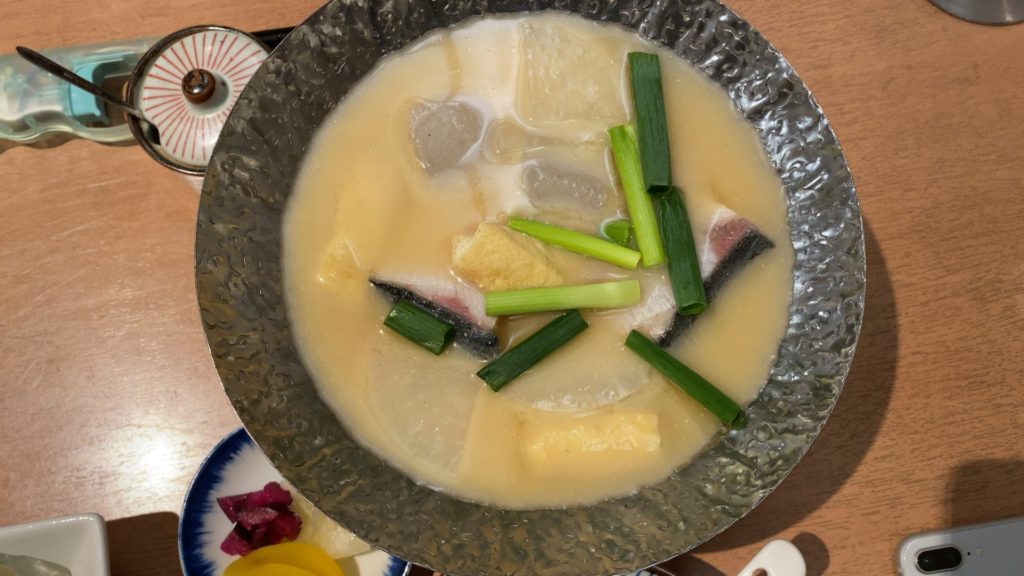 そして食べ始めたときに火を付けて、いい感じになってたのが白みそ仕立ての大きなブリの切り身が入った鍋です。